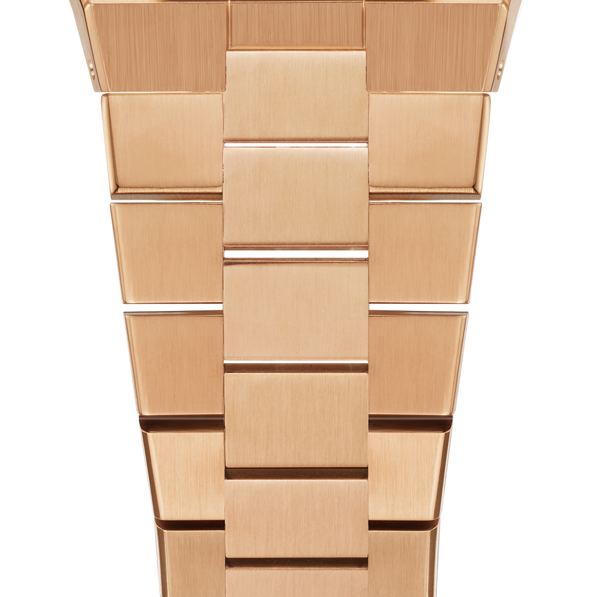 The middle link is rectangular, and the outer side gradually narrows from a trapezoid to a rectangle, which is wider and more varied, complementing the bold design of the dial.