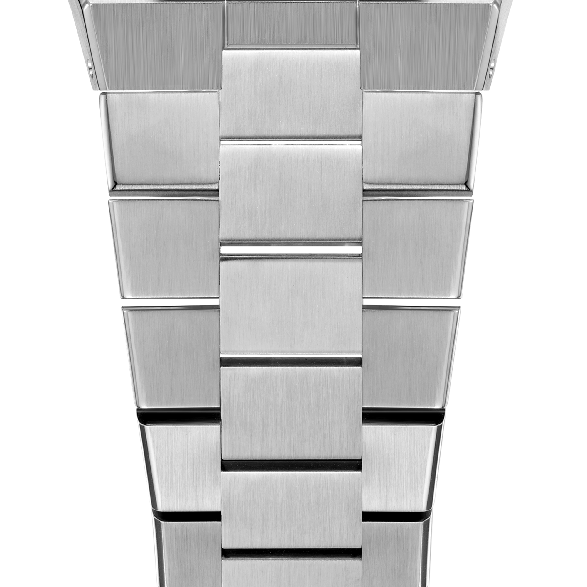 The middle link is rectangular, and the outer side gradually narrows from a trapezoid to a rectangle, which is wider and more varied, complementing the bold design of the dial.