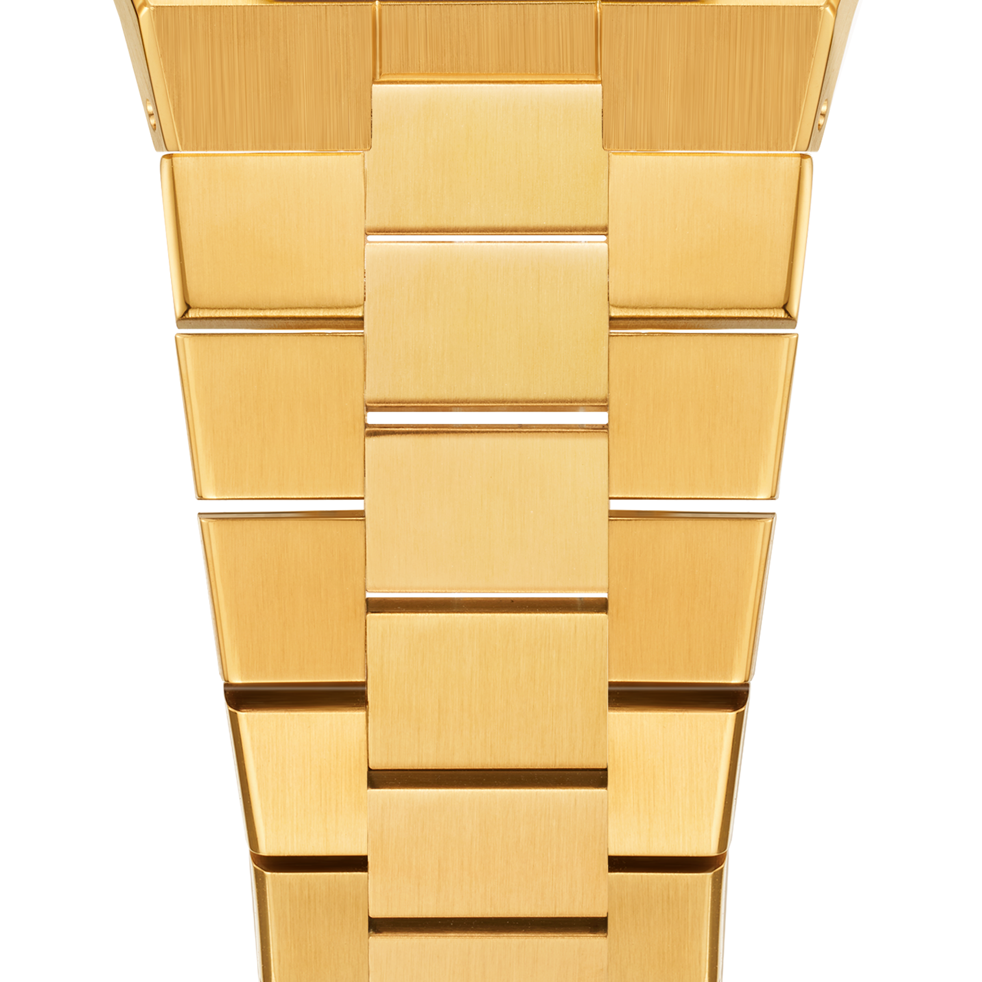 The middle link is rectangular, and the outer side gradually narrows from a trapezoid to a rectangle, which is wider and more varied, complementing the bold design of the dial.